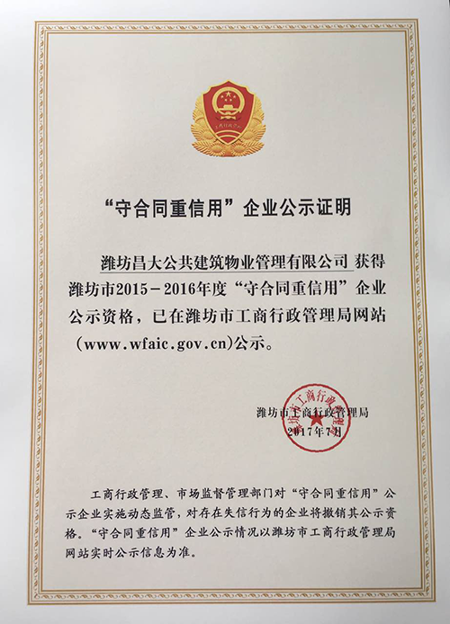 近日,濰坊市工商行政管理局公布了“濰坊市2015--2016年度“守合同重信用”企業(yè)公示名單。濰坊昌大公共建筑物業(yè)管理有限公司獲此殊榮。榮獲“守合同重信用”企業(yè)稱號,是我市政府部門及社會各界對“昌大公管公司”長期以來堅持誠信經(jīng)營、嚴(yán)守合同的充分肯定,也體現(xiàn)了“昌大公管公司”良好的企業(yè)信譽(yù)。 ......