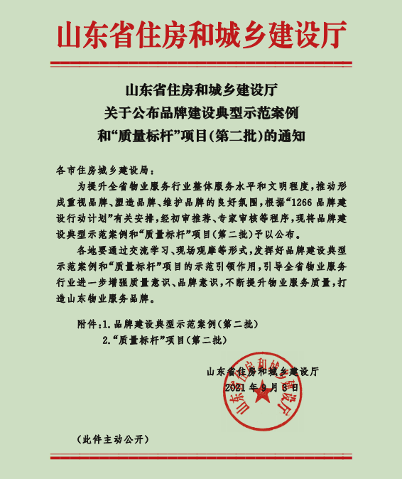 9月3日,山東省住房和城鄉(xiāng)建設(shè)廳公布關(guān)于品牌建設(shè)典型示范案例和“質(zhì)量標(biāo)桿”項目(第二批)名單,我公司作為品牌建設(shè)典型示范案例予以公布、服務(wù)管理的濰坊市文化藝術(shù)中心和峽山區(qū)創(chuàng)新創(chuàng)業(yè)服務(wù)中心同時獲得質(zhì)量標(biāo)桿項目。 ......
