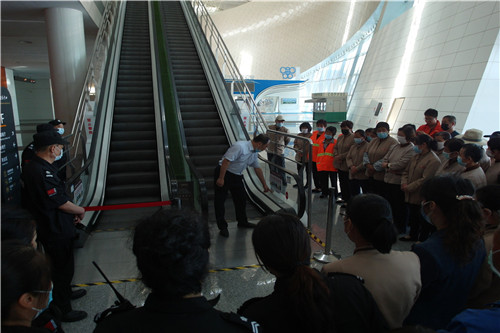 上圖為現(xiàn)場講解自動扶梯的工作原理及緊急處置方法
